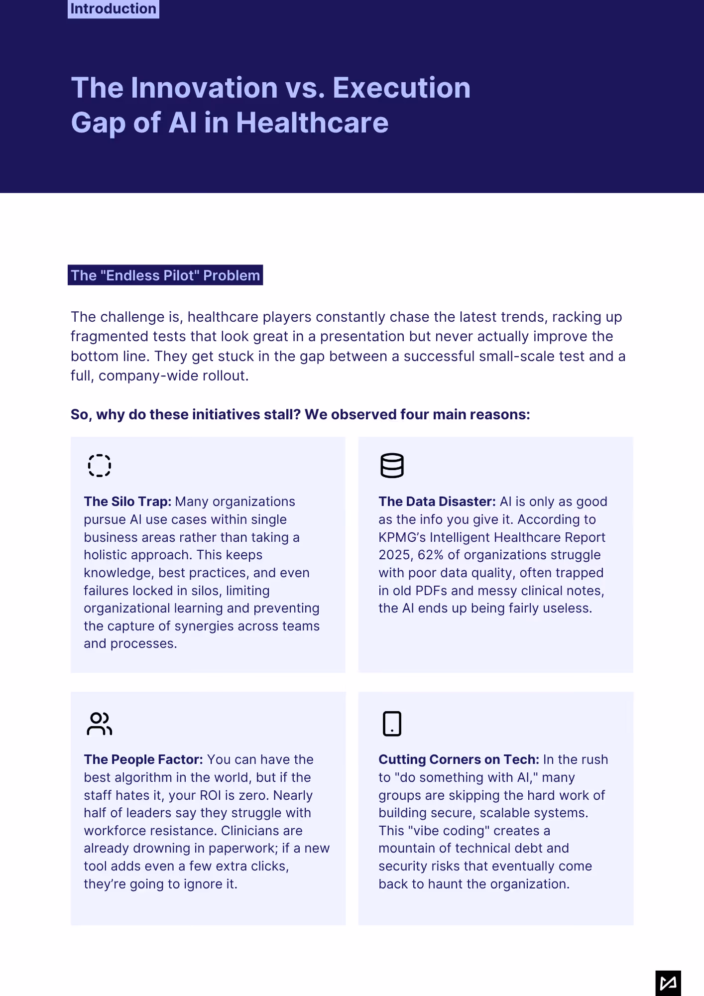 This whitepaper gives you the exact framework to close that gap. You'll get a clear diagnosis of the barriers blocking AI ROI in healthcare, pragmatic toolkits addressing the six dimensions that determine whether AI scales or stalls, and a real case study from a leading European healthcare organization — from initial pilot to enterprise operation. Practical, sequenced, and built for leadership teams ready to stop experimenting and start delivering.